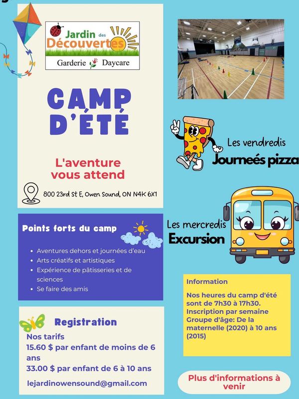 La garderie du Jardin des découvertes, un programme francophone, doté d`une philosophie centrée sur l`enfant. Notre program permet à l`enfant de grandir et de se développer intellectuellement, socialment et physiquement. Notre programmation favorise le développement de compétences langagières en français et l`appréciation de sa culture canadienne française par le biais de diverses activités culturelles.
